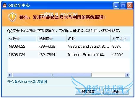 根据QQ软件安全组对流行盗号木马病毒的分析数据显示,部分盗号木马病毒能够利用某些操作系统漏洞侵入用户计算机,伺机盗取QQ密码。即使计算机杀毒软件能够及时清除盗号木马,盗号木马仍可以再次利用系统漏洞反复入侵您的计算机。因此,我们强烈建议您定期检查修复操作系统漏洞。检查及修复操作系统漏洞的方法如下: