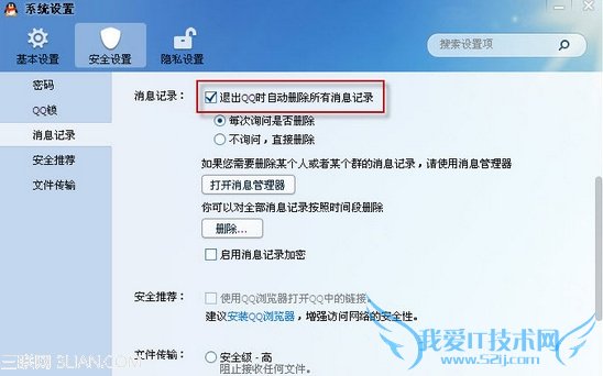 4.勾选:退出qq时自动删除所有消息记录”然后关闭就可以了。