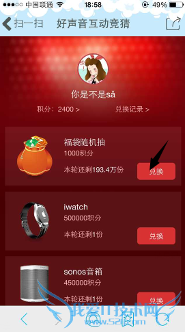2、这个时候我们就可以看到好声音互动精彩的活动首页,首次登录都有2500积分,我们忽略竞猜栏目,直接兑换礼品;