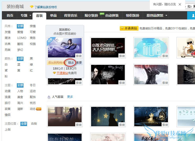 2、接着在“装扮商城”最下面找到“套装”当鼠标悬停在相应的装扮上时,就会出现“赠送”按钮,点击即可向好友赠送。