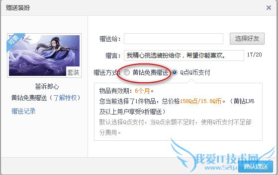 3、接着选择要赠送的好友,并且选择“黄钻免费赠送”项,最后点击“确认赠送”按钮即可。当然,对于装扮的赠送,也支持Q点/Q币赠送方式,这就需要我们去充值了。