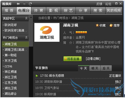 1.所有频道列表:列出了腾讯视频播放器提供的所有直播频道,选择喜欢的频道,点击进入即可看到该频道的节目预告。如选择“电视台”——“湖南卫视”,点击即可进入“湖南卫视”频道,点击“观看直播”即可开始欣赏该电视台的节目了。