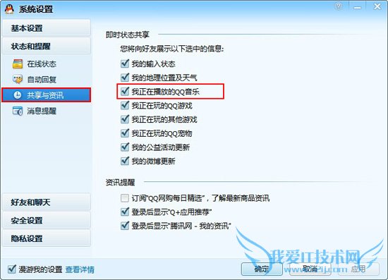 1、点击qq主界面上面的“打开系统设置”,然后打开了系统设置创建,在点击选择“状态和提醒”,然后点击“共享和资讯”选项,这样就右边的窗口上勾选“我正在播放的qq音乐”选项。然后保存设置即可。如图所示: