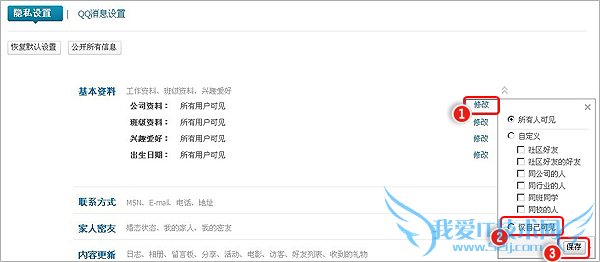 2、在隐私设置页面,您可以将您不想公开的资料设置为【仅自己可见】即可。