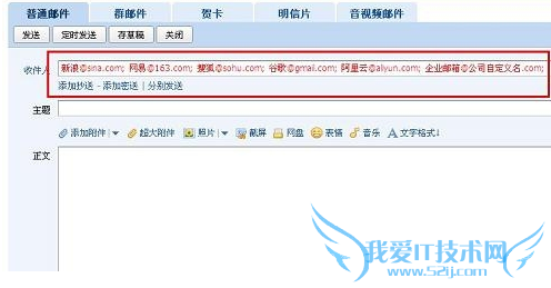若您想抄送信件,请点击“添加抄送”,将会出现抄送地址输入栏。抄送就是将信同时也发给收信人以外的人,请将他(她)的 email 地址写在这一栏中。如果是多个地址,在地址间请用“;”隔开,也可多次点击右边的“通讯录”选择多个收件人,与此同时收件人知道您将这封信抄送给其他人;