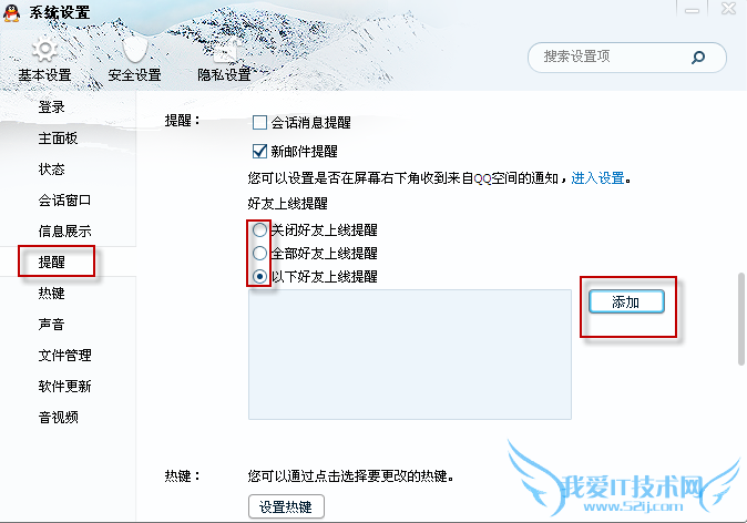 2、在系统设置中选择“提醒功能”,就会出现三个选择:关闭、全部、以下,如果选择是的以下也就是对不分好友的上线会提醒,你就可以进行随意的添加。