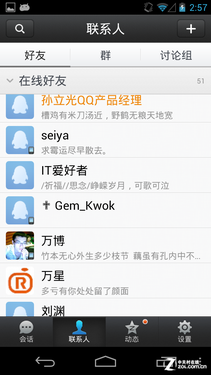 当然,QQ毕竟不是微信。微信的好友是按首字母来分类的,但手机QQ则采用了和PC端完全一致的分类方式,我们可以搜索好友、添加好友、查看在线QQ好友,功能非常全面。