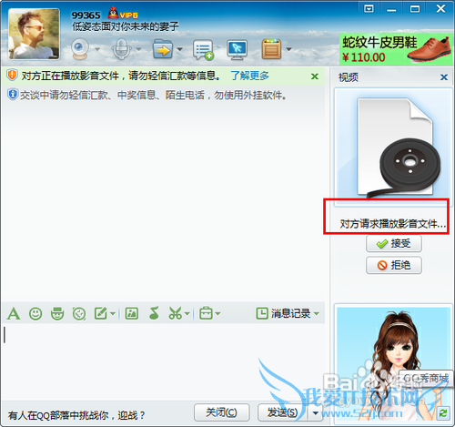 4.对方就会收到QQ视频的邀请,提示”对方请求播放影音文件“,我们点击确定按钮,如图所示: