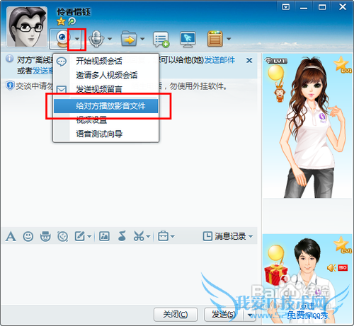 2.然后点击如图所示的视频播放按钮,选择“给对方播放影音文件“选项,如图: