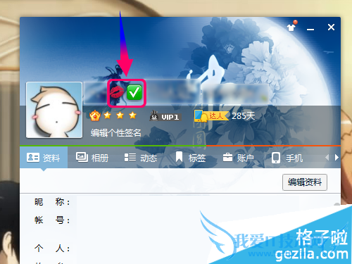 保存修改后的QQ呢称,那个红唇和已认证的绿色符号是不是出来了?