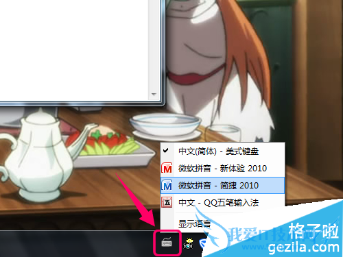 1:点击任务栏的输入法,选择输入法为[微软拼音],版本没多大的区别不必在意