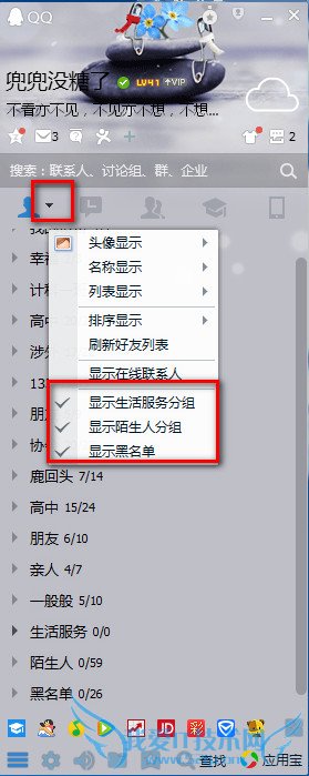 2、点击联系人处的下拉箭头之后出现下拉菜单,然后会看到下拉菜单上面的显示生活服务分组左侧打了勾,把勾去点就不会显示生活服务分组了