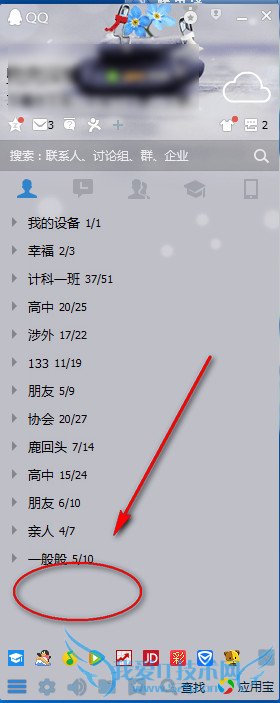 1、登录到自己的qq帐号以后,鼠标移动到qq面板上面的联系人处会出现一个下拉箭头,用鼠标点击下拉箭头