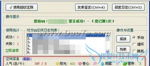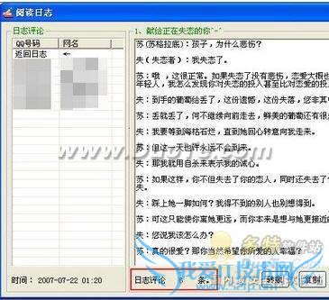 先用“回复日志”按钮,将好友的日志列表加载过来,在界面中我们能看到好友空间的人气等信息。在列表框中选择你感兴趣的文章,按“阅读”按钮可以先进行预览(如图5)。