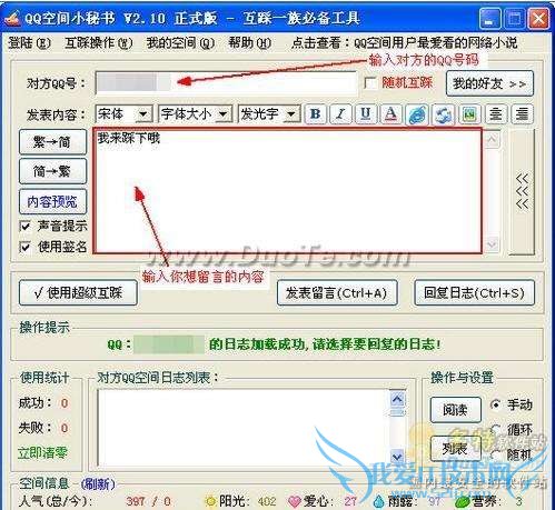 登录成功以后,在“对方QQ号”处填写你想留言的好友QQ号。随后,在“发表内容”处,写上你要留言的信息(如图2)。