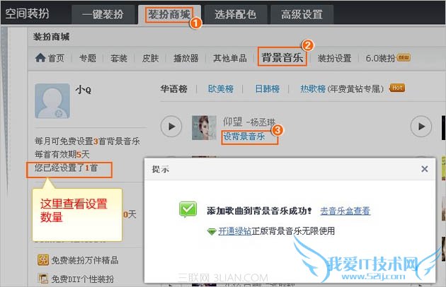 注:若您开通了绿钻,在查询歌曲数量的位置不会显示设置数量,只会提示您:您是绿钻贵族,可以无限量设置正版背景音乐。您可以到“音乐盒”---->“背景音乐”中查看歌曲情况以及管理背景音乐。