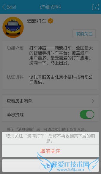 在这里便可以选择取消关注和关闭消息提醒,取消关注是不再不使用其服务,关闭提醒则是不接收服务提供的通知,但是需要的时候可以继续使用。