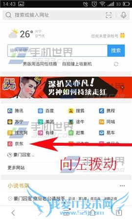 1)进入手机QQ浏览器首页,【向左拨动】,点击【小说书架】。(如下图)