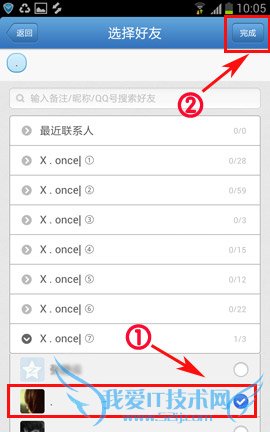 3)在页面的右上角,点击添加,并且选择需要屏蔽的好友,然后点击完成,即可屏蔽此好友信息。(如下图所示)