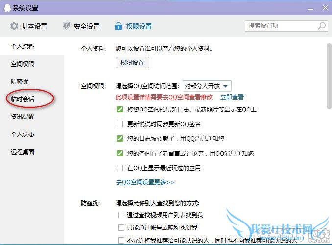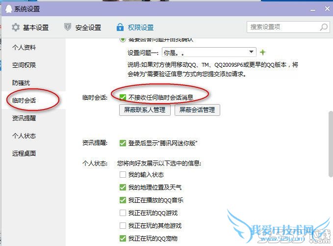 4、点击“临时对话”后的对勾,“不接受临时对话”这样只有好友列表中的好友给你发信息才能收到,其他的信息自动屏蔽
