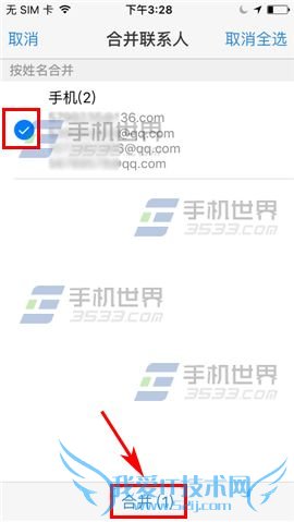 2)点击【合并联系人】,自动识别相同名称联系人,接着选择你要合并的联系人,点击下方【合并】即可。(如下图)