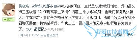 不仅学生有自己的QQ群,老师们也流行有自己的QQ群。“学校各教研组一直都是QQ群教研活动,我们语文组正围绕着‘如何提高学生阅读’话题进行 QQ群教研,当我们聊得热火朝天,坐在我对面桌的李老师突然不发言了,问他原因,他说‘怎么突然找不到聊天屏幕,快快帮帮我’我过去一看,原来她无意中把群聊转为共享了”。事实上,和网友“吴晓晓”一样,现在QQ不仅成为老师间分享教研经验的便捷工具,更成为学校、老师一种新的教育管理方式,网络时代下的师生关系因为结合了QQ这种沟通工具而更加紧密,教学相长,教师和学生不仅是良师,亦是益友。