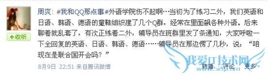 “外语学院伤不起啊…当初为了练习二外,我们英语和日语、韩语、德语的童鞋组织建了几个Q群,经常在里面彪各种外语。后来聊着聊着就乱套了,有次正练着二外,辅导员在班群里发了条通知,大家呼啦一下全回复的英语、日语、韩语、德语……辅导员在那里楞了几秒,说:‘咱们现在是联合国开会吗?’” 网友“周爽”在微博上分享了QQ变身“外语角”的趣事。像这样同学之间用QQ群来交流学习、维系情感的方式在校园里早已流行开来。“三人行,必有我师”,有共同学习目标或一个班级的同学组建一个QQ群,啥事儿都在群里讨论,在QQ群里实现资源共享,取长补短,学习起来自然事半功倍。