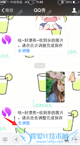 3、绑定成功后,点击最下方的“图片秀”,再给对方发一张你喜欢的图片。这时再按提示“去调整”并保存。