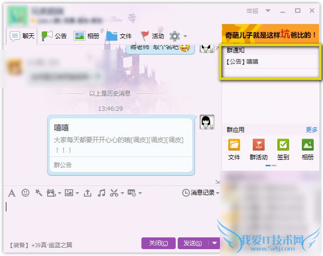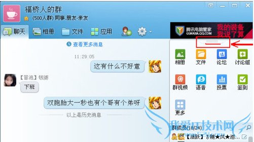 如果你是老版本的QQ,在群聊天右侧,如图所示用鼠标找开群设置公告对话框。