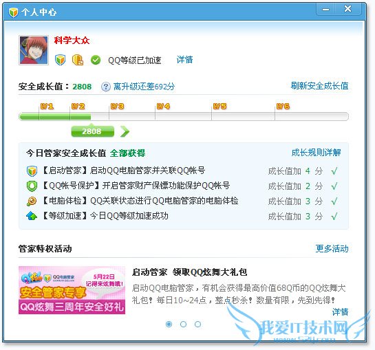 使用QQ电脑管家,关联QQ帐号QQ等级加速成功。