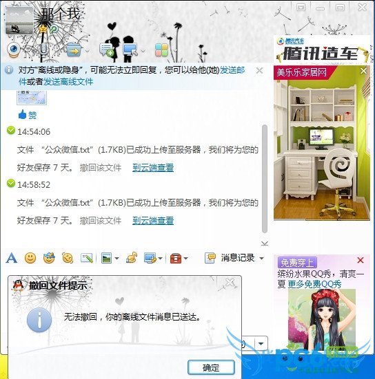 6. 如果QQ提醒你“无法撤回,你的离线文件消息已经送达”。这样,证明对方是设置了隐身状态,是在线的。经测试,这无论对方接收或不接收都有效。