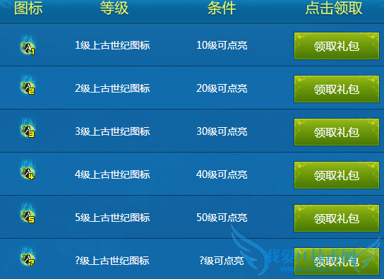 1、只要您的角色达到指定等级,点击图标即可升级上古世纪图标和领取礼包,礼包详情>>;