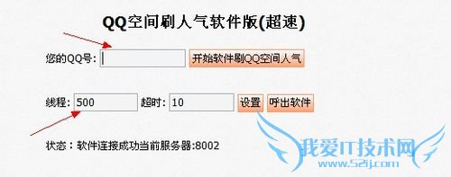 然后先把QQ空间刷人气软件版(超速)这地方设置好,不然点击上面的刷人气也没用处,先把线程写好。线程数字大刷的就越快,但是配置不好的就不要写太大了。推荐500,然后在输入自己要刷人气的QQ。超时不写默认就OK,然后点击设置,在点击上面的开始软件刷QQ空间人气按钮