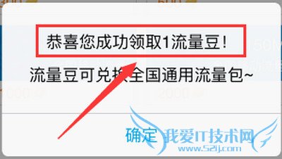 第六步:点“领取”按键后,系统就会自动送我们1个流量豆并出席提示对话框,并且在对话框中说明了流量豆的作用