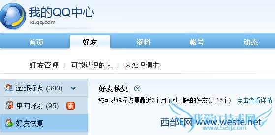 第二步:在“我的QQ中心”点击“好友”,选择“恢复好友”,点击“点击查看详情”连接,下方就会列出符合上面三个要求的被删QQ好友列表。