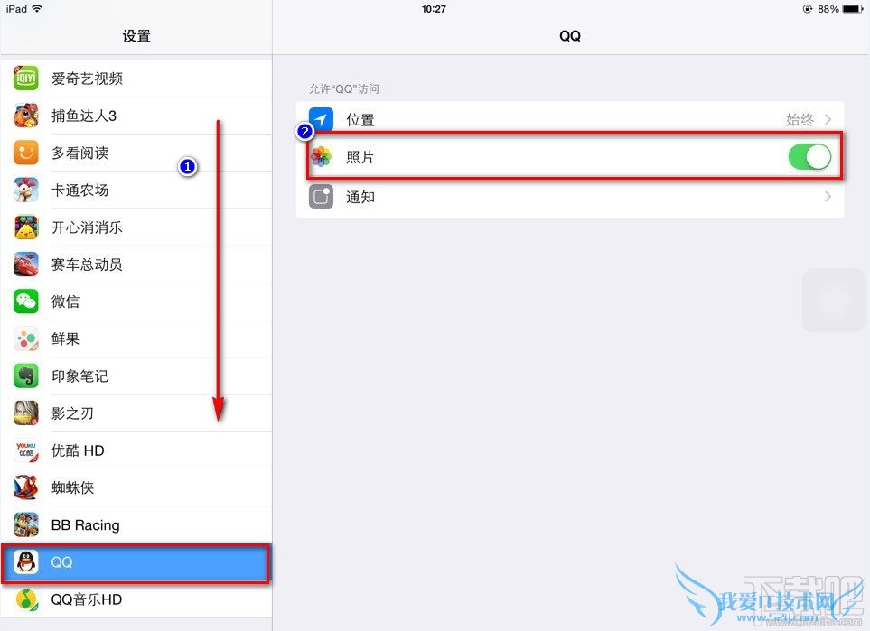 2:打开“设置”,左边↓滑,找到QQ,点击。会看右边的权限设置,打开照片就可以了。