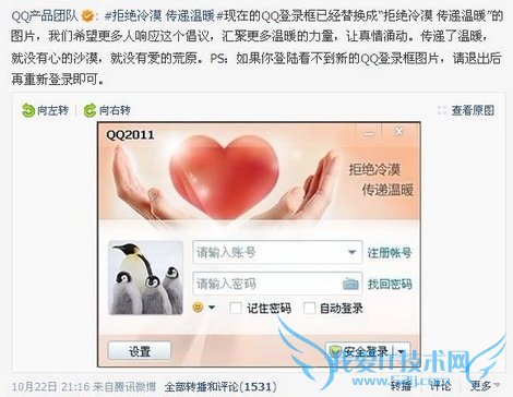 据了解,这是QQ产品团队在10月21日发起的号召亿万用户“拒绝冷漠,传递温暖”的微博线上爱心传递活动,倡议网友通过QQ签名传递爱心,一起汇聚温暖的力量,活动得到众多网友的积极响应。截至10月23日,短短两天时间已有将近1,835,649名网友积极响应号召,在QQ签名中点亮爱心图标,传递温暖。而在QQ产品团队的官方微博中,也有超过20万名网友对/wennuan/行动进行转播评论。