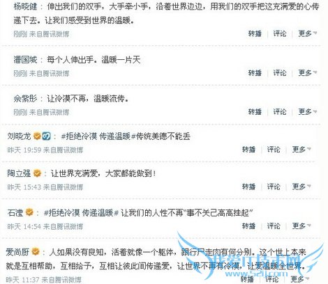 “#拒绝冷漠 传递温暖# QQ产品团队号召亿万用户,拒绝冷漠,传递温暖。让我们拥有一颗乐于助人的心,一双搀扶他人的双手,让这路上再没有摔倒的弱者,没有冷漠奔走的路人。如果你能做到,请在QQ签名中输入文字‘/wennuan/’,传递这个倡议,一起汇聚温暖的力量。你能做到吗?”10月21日晚,QQ产品团队在其官方微博上发起活动倡议,号召网友在QQ签名中输入“/wennuan/”,传递爱心图标。网友们纷纷表示坚决支持这样的活动,并表示要将这个爱心继续传递下去,让爱心亮在每一个好友的QQ签名里,亮在每一位中国人内心里。