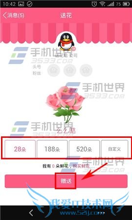 3)选择你要赠送的【对象】,接着选择或自定义鲜花数量,点击赠送。注:没有花点击数量选择下方购买鲜花进行购买。(如下图)