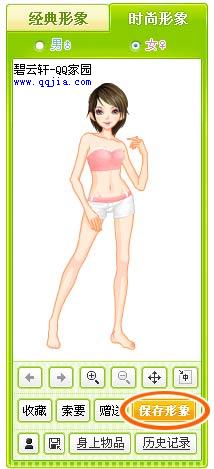 进行一系列试穿操作后(关于试穿见前文),决定购买当前穿着在您的QQ秀形象上的新商品,你只需在商城中点击您QQ秀形象下的"保存形象"按钮。