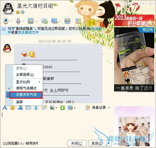 2、在聊天内容界面右键单击,选择设置多彩气泡。