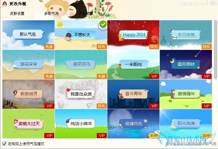 3、在新出来的界面就会有很多的多彩气泡选择,有免费的、有限免的...点击喜欢的出现√即为自己选中的。
