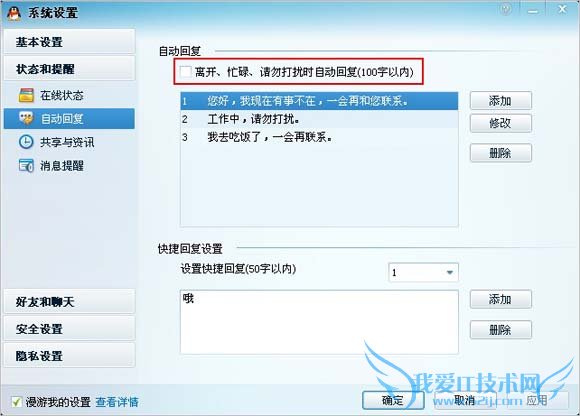 跟设置设置qq离开自动回复方法相反,点击去掉“离开、忙碌、请勿打扰时自动回复(100字以内)”前面的对勾即可。