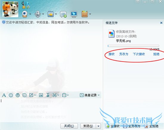 当对方发送了qq离线文件之后,qq窗口会自动跳出来,如图所示,网友就直接点击接受文件即可,如果要保存到桌面或者指定位置的话,就点“另存为”,在将离线文件保存到你指定的位置即可。如图所示: