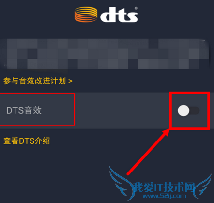 5、进入DTS音效设置页面后,首先点击开关按钮将DTS音效开启。