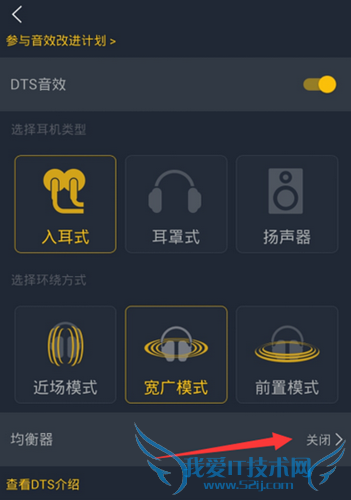 6、开启DTS音效后,根据耳机类型选择相应的模式和场景,然后直接返回即可。