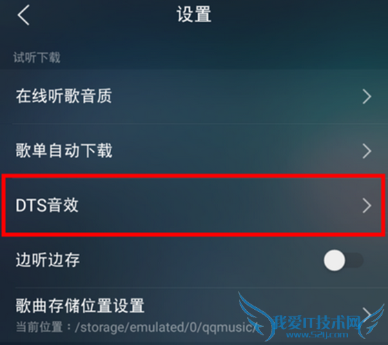 4、在手机QQ音乐设置页面,点击“DTS音效”选项。如果没有DTS音效,更新版本。