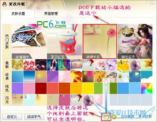 2.选择自已喜欢的皮肤,如果要透明的话点窗口右下方倒数第四个按钮,将滚动条拖动到最上方就将皮肤全透明啦。(如果想使用自已从网上下载的皮肤的话就可以点自定义,后面的步骤一样)。