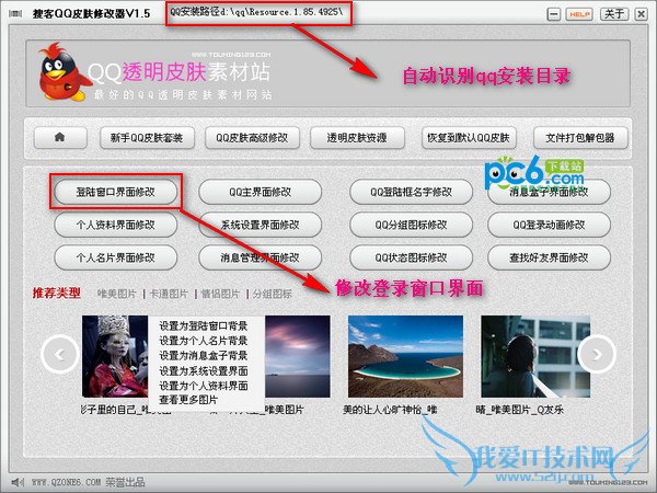 1.首先在pc6下载搜客QQ皮肤修改器,然后打开,这款工具会自动识别你的qq安装路径,如果想设置透明皮肤的话,打开时会弹出确认自动设置透明皮肤,点确认即可。