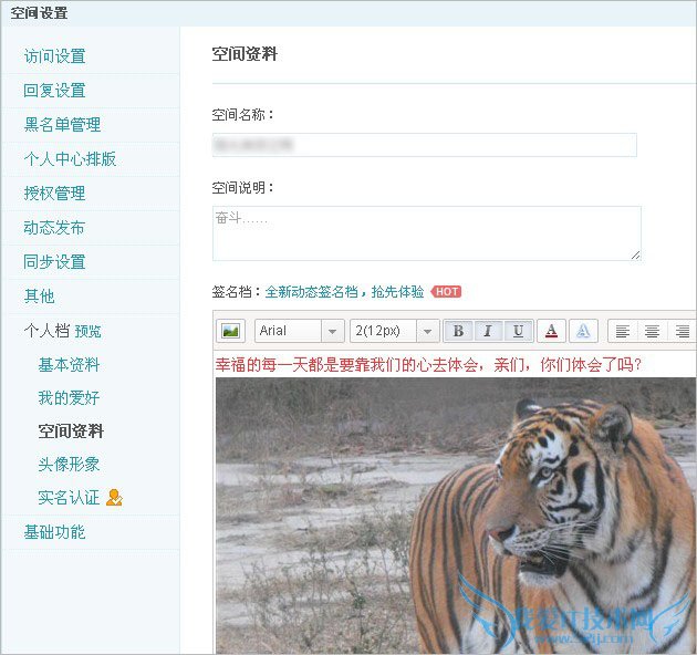 “空间资料”,在签名档下您就可以设置签名档了。首先,需要您写出符合您个性的签名;